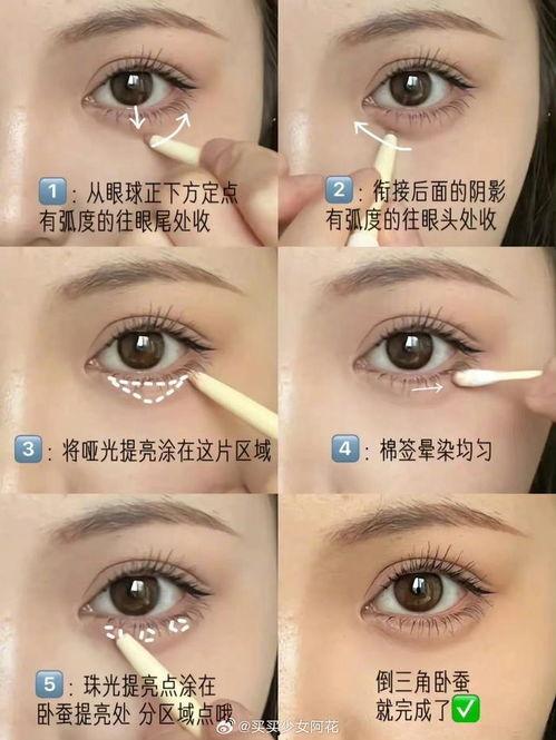 这个教程非常简单,适合初学者。首先,用铅笔轻轻勾勒出卧蚕的轮廓,然后选择一个与肤色相近的眼影填充颜色,最后用眼线笔强调边缘即可。