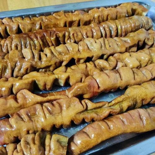 7. 出锅:当猪大肠表面呈现出金黄色,且香气扑鼻时,即可出锅。